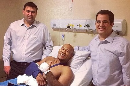 R. Jacaré posa ao lado dos médicos após cirurgia no cotovelo. Foto: Reprodução/Instagram Apontado por muitos como um dos favoritos para disputar o cinturão dos médios após o duelo entre Vitor Belfort e Chris Weidman, adiado para 2015, Ronaldo Jacaré aproveitou a folga na agenda, já que não tem luta marcada, e submeteu-se a uma cirurgia no cotovelo direito nesta terça-feira (07). Em seu perfil oficial no Instagram, o brasileiro divulgou uma foto sua ainda no hospital e comentou o procedimento. “Obrigado aos meus médicos, Dr. Bruno Lobo Brandão e Dr. Rickson Moraes. Passei por uma cirurgia para descomprimir o nervo ulnar, que me causava grande desconforto e perda de força nas mãos. A cirurgia foi bem sucedida e eu já me sinto melhor!”, escreveu Jacaré juntamente com a foto na rede social. Aos 34 anos, Ronaldo Souza tem um cartel profissional de 21 vitórias, apenas três derrotas e um empate. Multicampeão no jiu-jitsu e ex-detentor do título dos médios do extinto Strikeforce, Jacaré atualmente ocupa o segundo lugar no ranking da categoria até 84 kg no UFC. Desde que estreou na maior organização de MMA do planeta, o brasileiro venceu suas quatro lutas, contra Chris Camozzi, Yushin Okami, Francis Carmont e Gegard Mousasi.