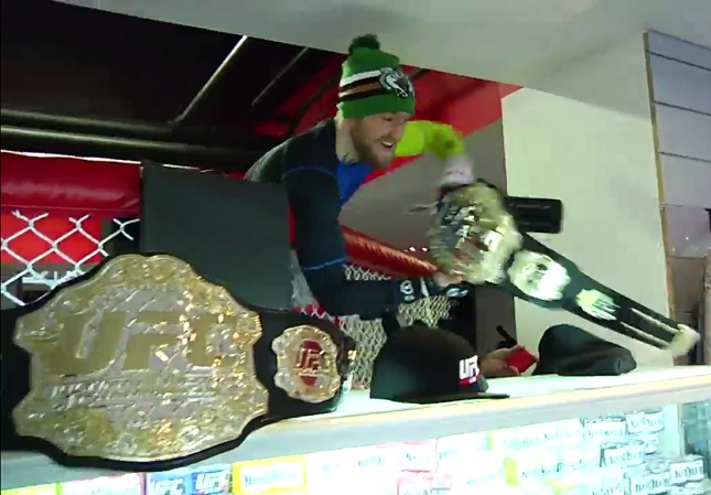 McGregor “rouba” cinturão do UFC em Boston. Foto: Reprodução Mesmo quando não é a grande atração, Conor McGregor costuma roubar a cena por onde passa. Agora, imagine quando o irlandês é a principal estrela de um evento? Protagonista da luta principal do UFC Fight Night 59, card no qual enfrenta Dennis Siver no próximo domingo (18), McGregor já começou a dar mostras de sua popularidade logo nos treinos abertos, realizados nesta quinta-feira (15) em Boston (EUA), e foi o centro das atenções.