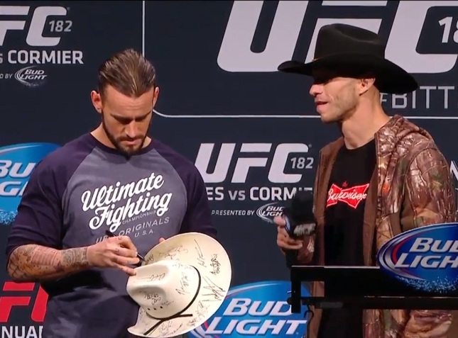 Punk (esq.) assina chapéu a pedido de D. Cerrone (dir.). Foto: Reprodução Contratado no fim do ano passado pelo UFC, o astro do prowrestling (ou telecatch, no Brasil) CM Punk causou grande alarde quando chegou ao octógono. Nesta sexta-feira (02), seu primeiro evento oficial na organização fez jus à toda a comoção gerada. Punk foi o convidado para a sessão de perguntas e respostas que antecedeu a pesagem oficial do UFC 182, em Las Vegas (EUA), e protagonizou um dos eventos mais divertidos dos últimos tempos, que incluiu até mesmo uma invasão do peso leve Donald Cerrone a fim de conseguir um autógrafo do novo lutador do Ultimate