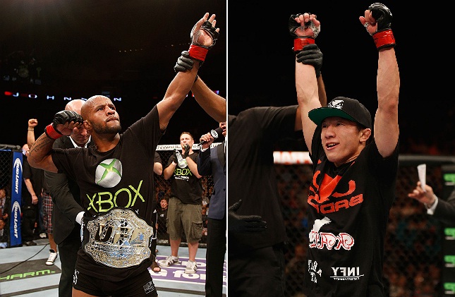 Johnson (esq.) e Horiguchi (dir.) fazem a nova luta co-principal do UFC 186. Foto: Produção SUPER LUTAS (Josh Hedges/UFC) A pouco mais de dois meses de sua realização, o UFC 186 acaba de ganhar um novo evento co-principal: a disputa do cinturão dos moscas entre Demetrious Johnson e o japonês Kyoji Horiguchi.