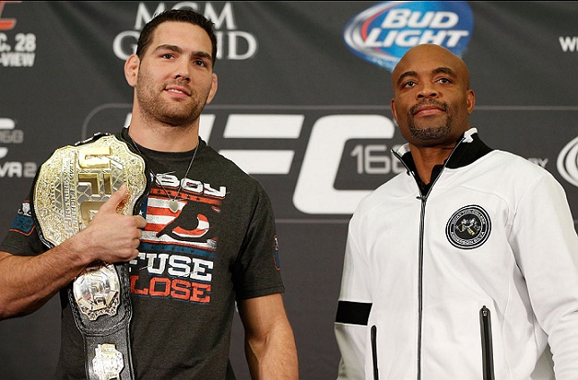 C. Weidman (esq.) voltou a lembrar duelos contra A. Silva (dir.). Foto: Josh Hedges/UFC No próximo sábado (23), Chris Weidman colocará o cinturão dos médios em jogo contra Vitor Belfort na luta co-principal do UFC 187, mas o norte-americano segue com outro brasileiro em mente: Anderson Silva. Algoz do Spider em duas oportunidades, Weidman escreveu um artigo no qual falou sobre o ex-campeão tupiniquim e deu mostras de que o fato de ter sido alvo de dúvidas mesmo após os triunfos ainda não foi completamente superado.