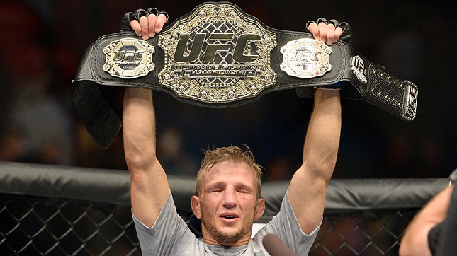 Dillashaw (foto) defendeu o cinturão dos galos pela segunda vez. Foto: Josh Hedges/UFC Parecia uma reprise da primeira luta entre TJ Dillashaw e Renan Barão. Pouco mais de um ano e dois meses depois do encontro original entre os rivais, o norte-americano repetiu sua atuação dominante, não deu chances para o brasileiro e defendeu o cinturão dos galos na luta principal do UFC on FOX 16, na noite deste sábado (25), em Chicago (EUA).