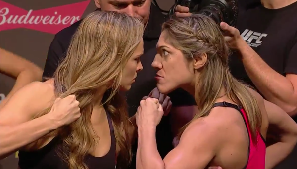 Bethe (dir) provocou Ronda na pesagem. Foto: reprodução Não podia ser diferente. A pesagem oficial para o UFC 190, no começo da noite desta sexta-feira (31), foi marcada por mais uma encarada tensa entre Bethe Correia e Ronda Rousey, que farão a luta principal para o evento de sábado. As duas lutadoras ficaram dentro do peso para o combate, com a brasileira, inclusive, ficando abaixo do limite permitido. A torcida parecia dividida entre as duas lutadores, com um misto de aplausos e vaias para ambas. Após descerem da balança, Bethe partiu para cima da norte-americana na encarada, novamente fazendo provocações. “Você vai ser nocauteada, vai cair com o meu soco”, dizia a brasileira, em português. Depois, Correia mandou um recado à torcida, mesmo àqueles que não irão torcer por ela. “Sei que muitos não torcem por mim, mas vou lutar por todo o Brasil”, disse. Já a campeã voltou a prometer uma vitória contundente. “A derrota mais devastadora que vocês vão ver da Bethe. Mal posso esperar para amanhã”, disse a lutadora norte-americana. Resultados da pesagem – UFC 190: Galos: Ronda Rousey (61,2 kg) x Bethe Correia (60,7 kg);