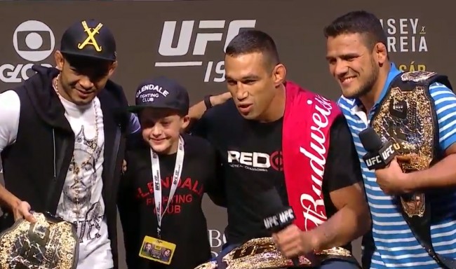 Garoto fica emocionado ao tirar foto com trio de campeões. Foto: Reprodução Como aquecimento para a pesagem do UFC 190, na tarde desta sexta-feira (31), o Ultimate preparou uma caprichada sessão de perguntas e respostas com os fãs presentes no ginásio da Barra da Tijuca, no Rio de Janeiro. O evento teve a presença dos três brasileiros detentores de cinturão no UFC, Fabrício Werdum, Rafael dos Anjos e José Aldo.